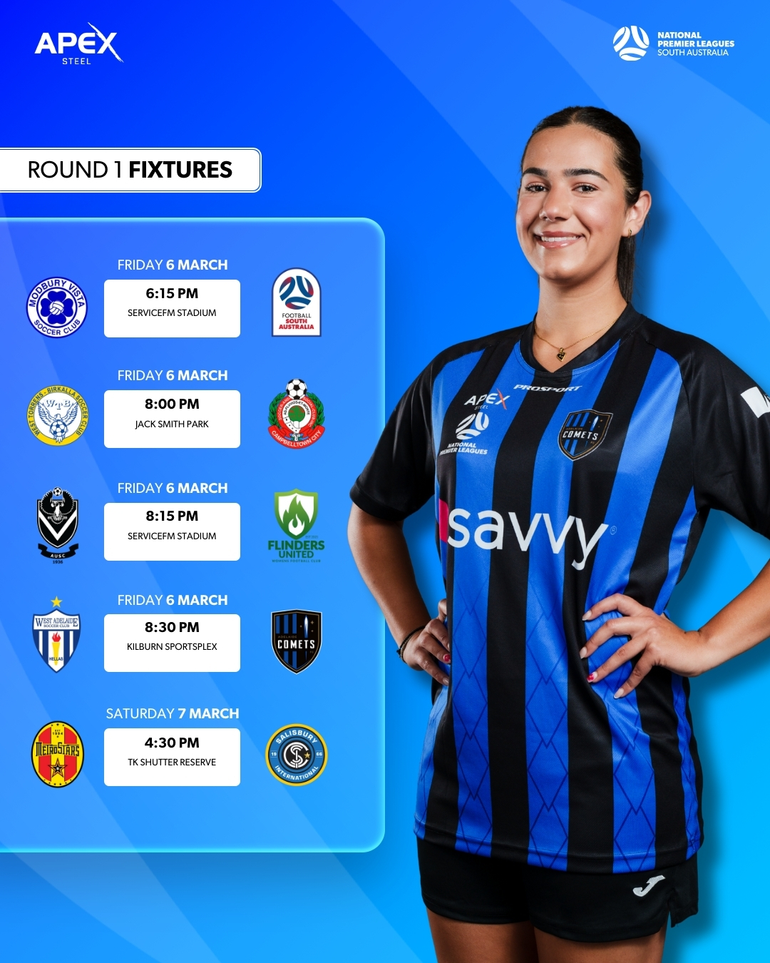 Later that night, Adelaide Uni faces Flinders United at 8:15 pm at ServiceFM Stadium. Round 1 also features a blockbuster clash as West Adelaide hosts Adelaide Comets in a late Friday showdown between the premiers and champions.