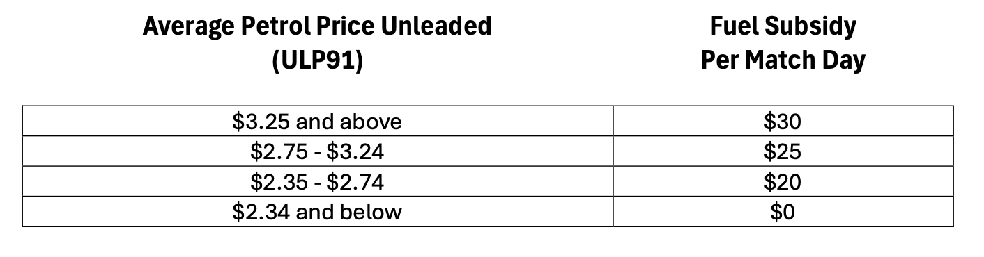 The fuel subsidy is in response to rising fuel costs and the importance of supporting match officials to ensure fixtures can proceed without travel related disruptions.