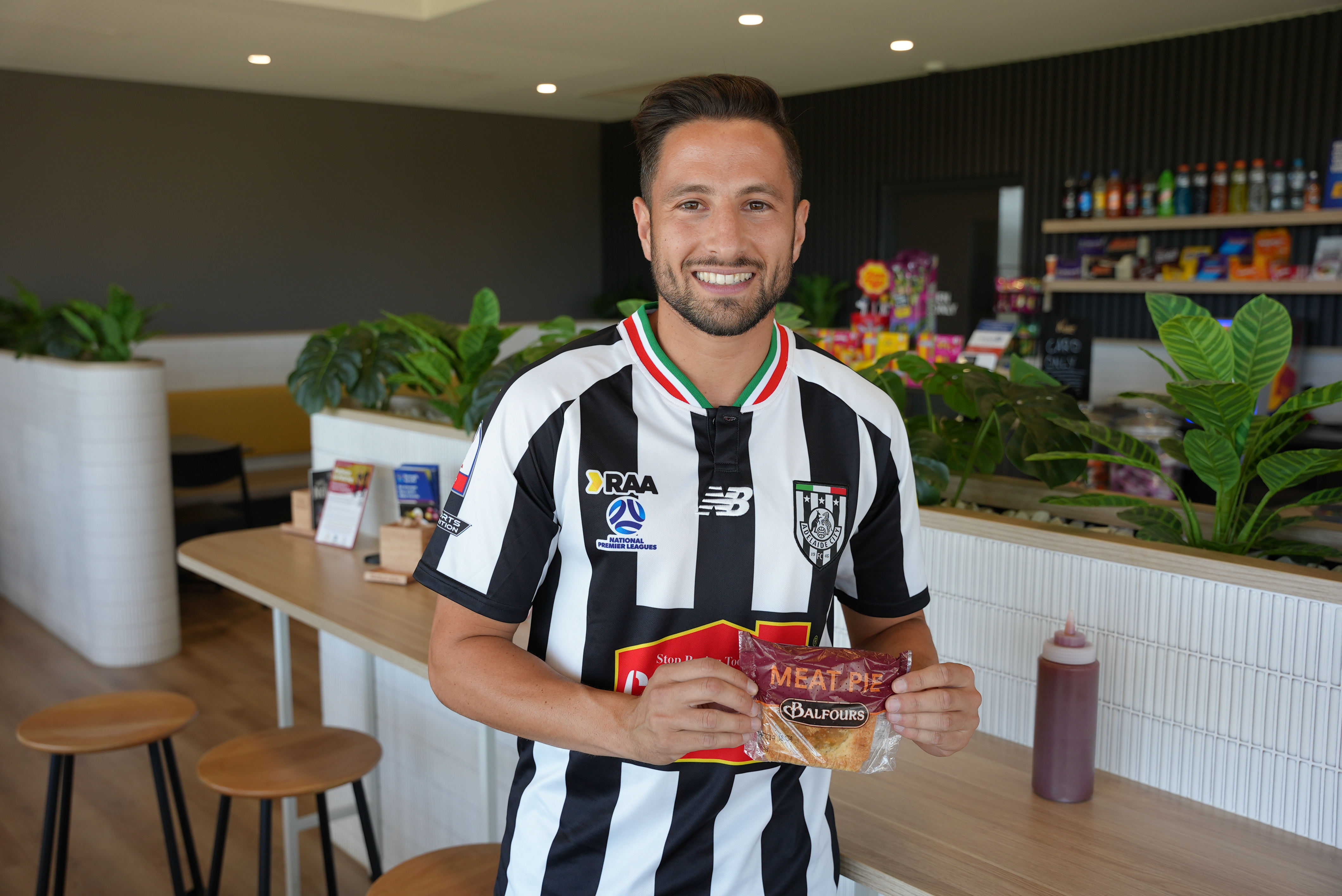 To celebrate the extension, we've invited Nic Bucco, Adelaide City's captain, to announce the news to football fans while enjoying a delicious Balfours pasty.
