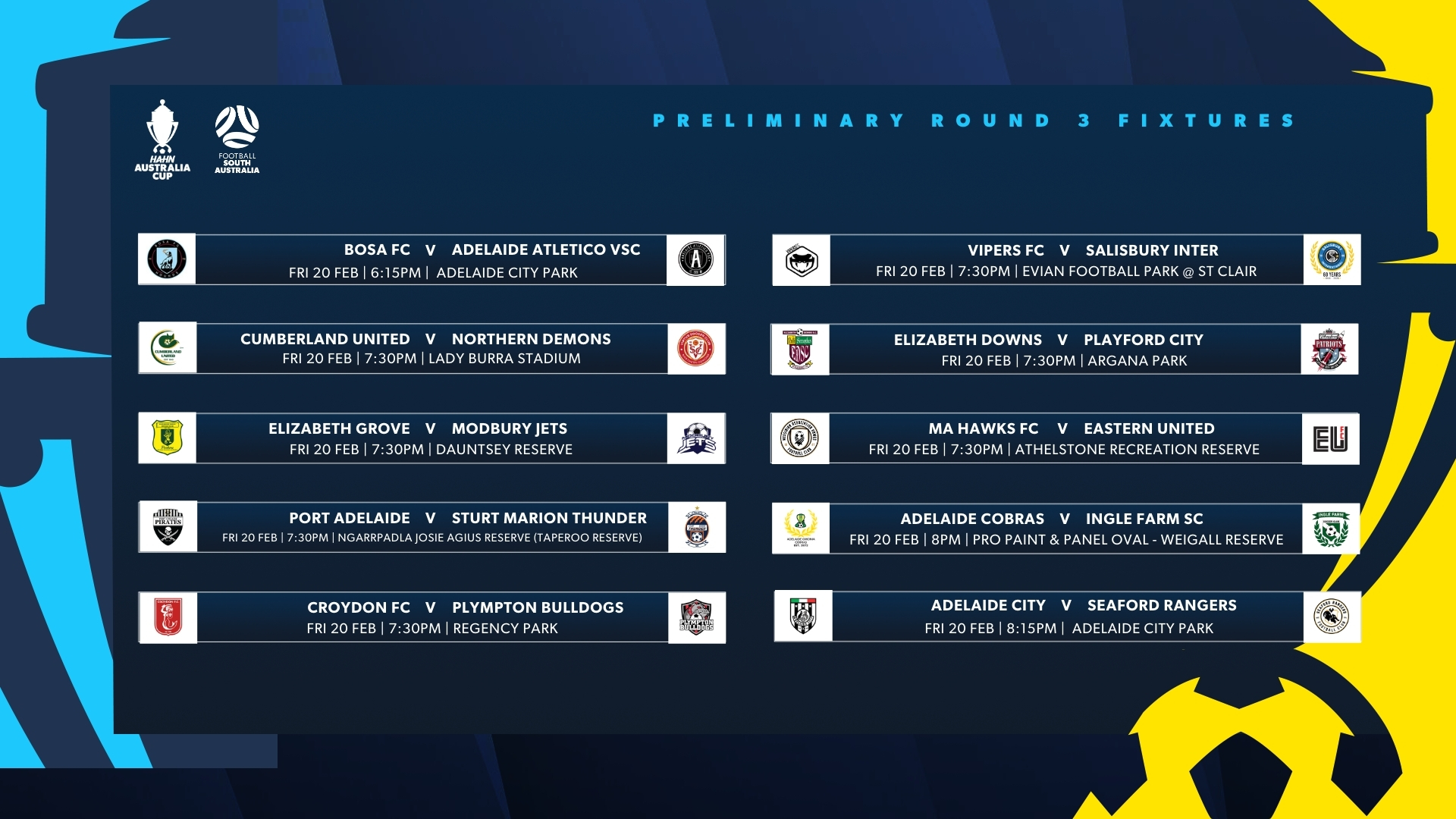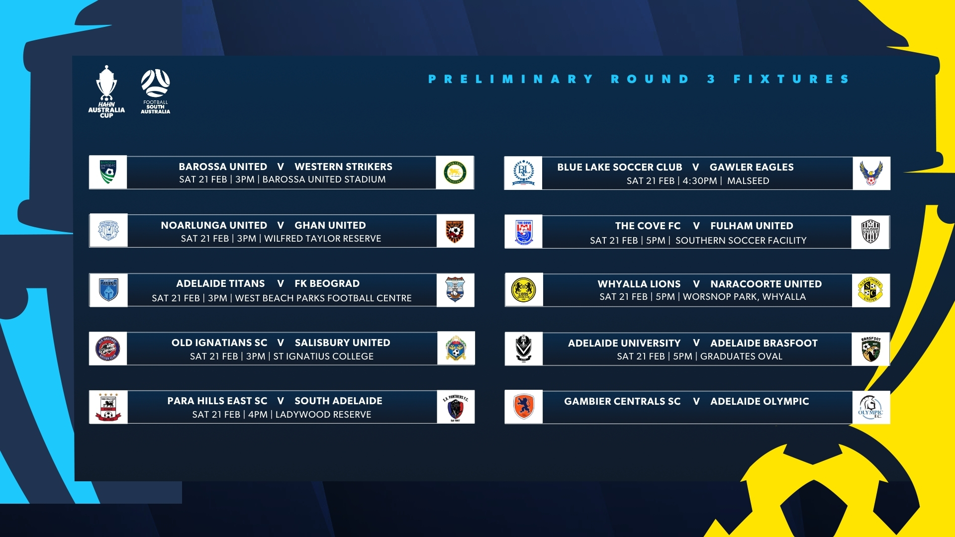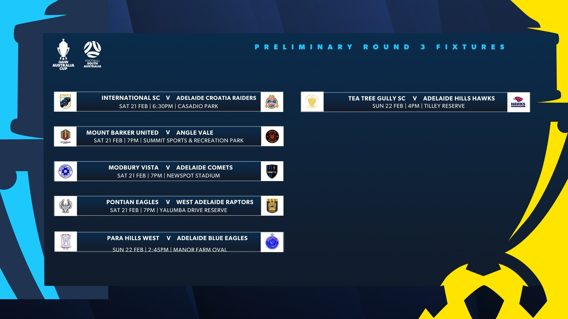 With the 2026 Hahn Australia Cup South Australia Preliminary Round 3 fast approaching, please see below the official dates and kick-off times for each fixture taking place between 20–22 February.