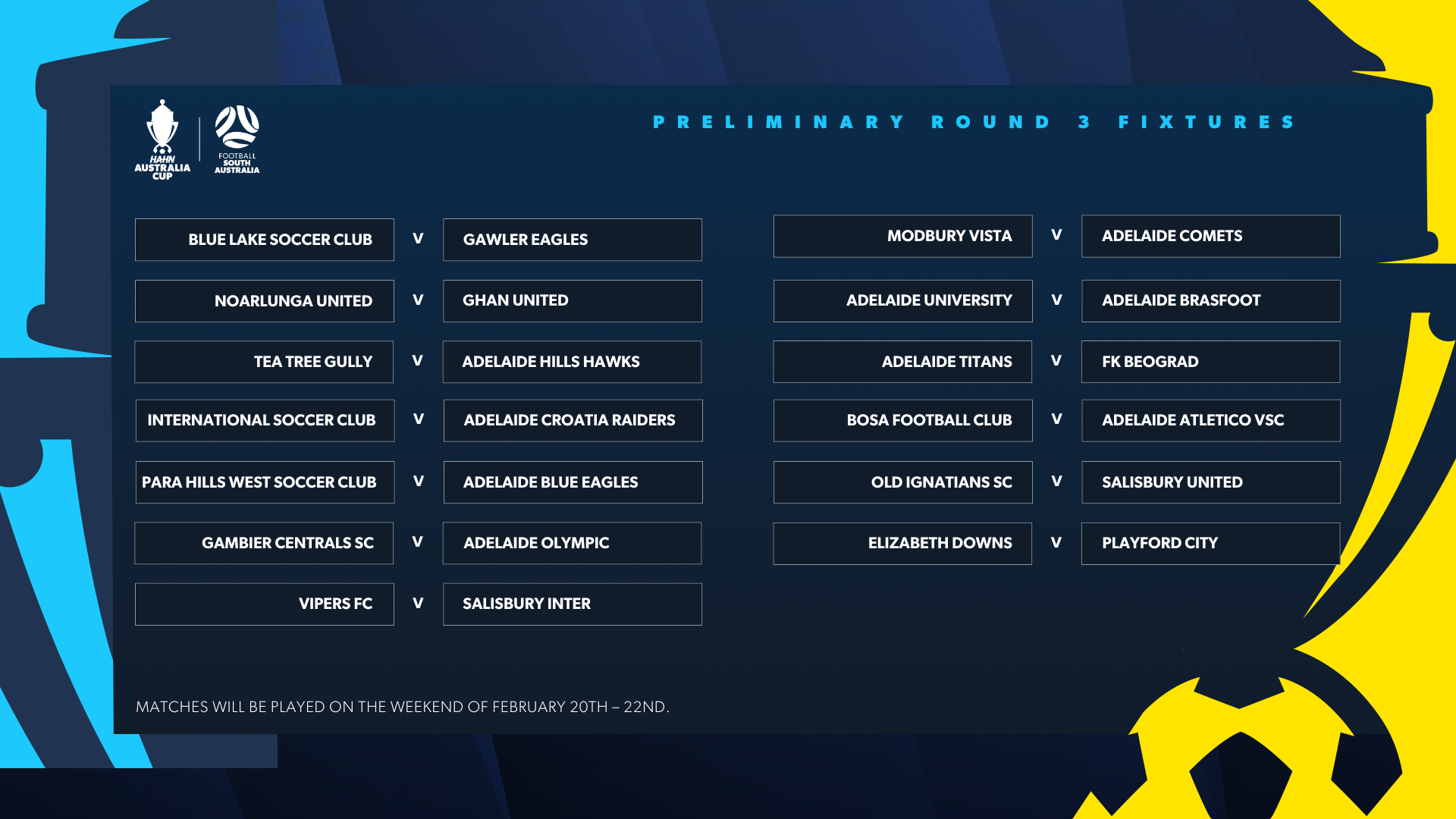 Football South Australia are excited to announce the 2026 Hahn Australia Cup South Australia Preliminary Round 3 Fixtures: