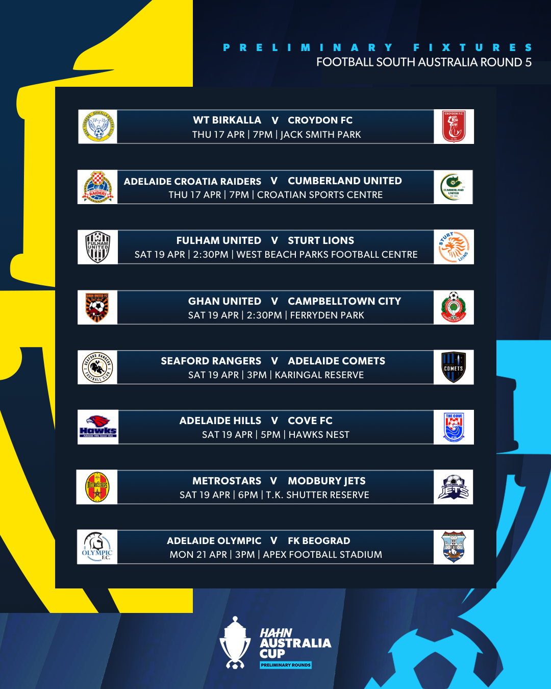 The Hahn Australia Cup South Australia Preliminary Round 5 fixtures are now confirmed.