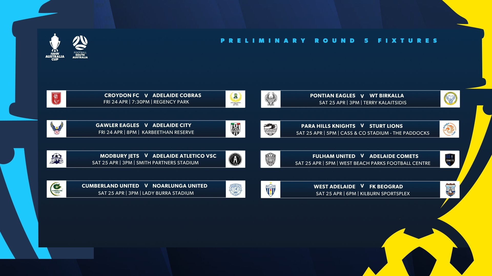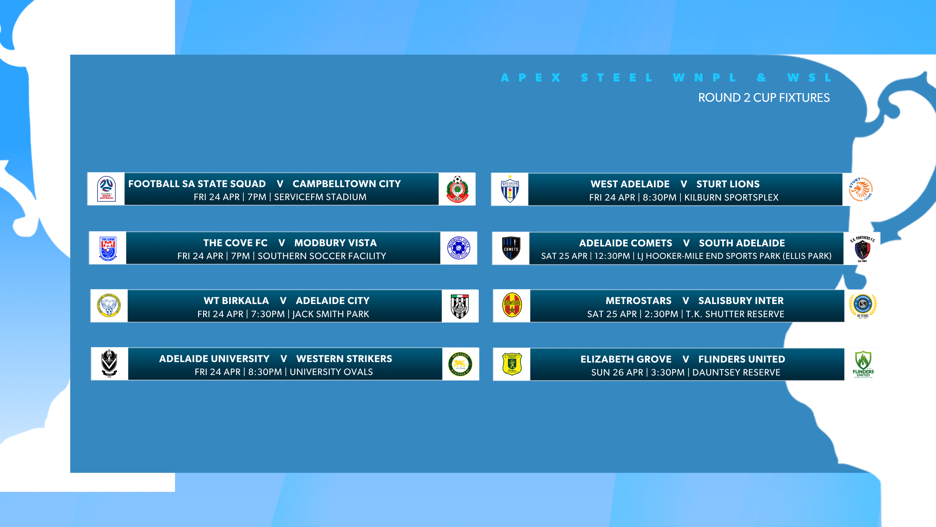 With the 2026 Hahn Australia Cup South Australia Preliminary Round 5 and APEX Steel WNPL & WSL Round 2 fast approaching, please see below the official dates and kick-off times for each fixture taking place between 23–26 April