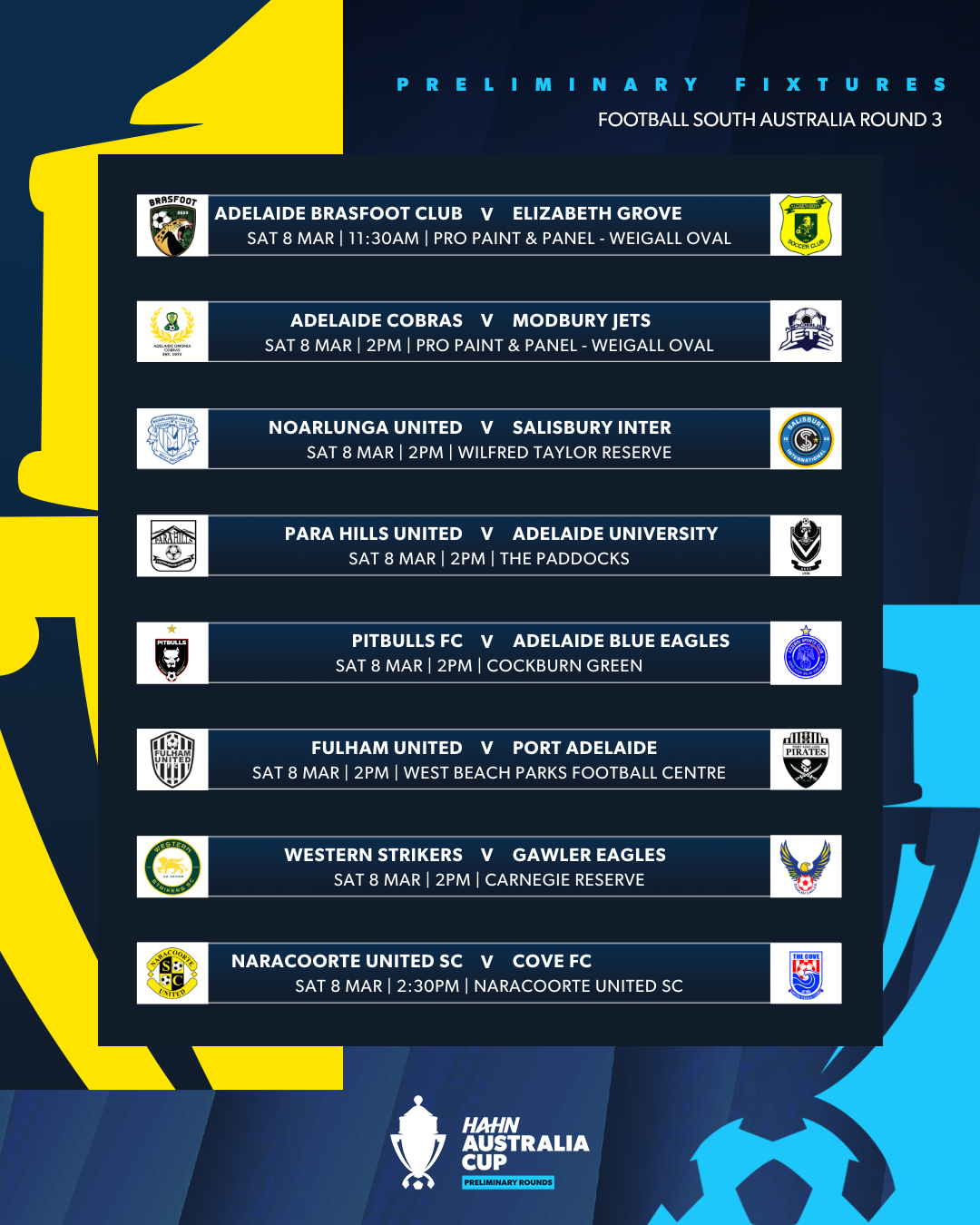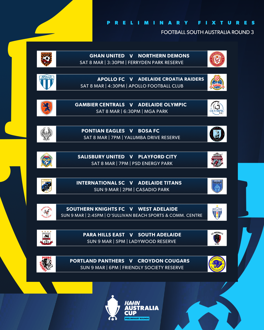 Football South Australia are excited to announce the 2025 Hahn Australia Cup South Australia Preliminary Round 3 Fixtures: