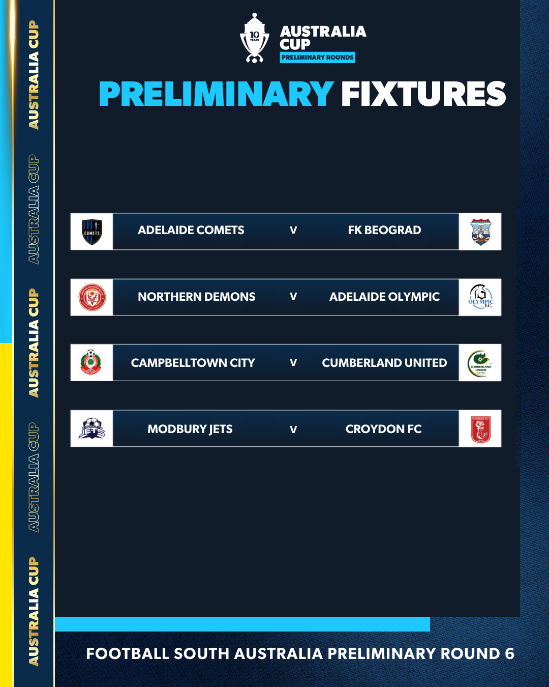 Football South Australia can announce the Draw for the South Australia Preliminary Round 6 of the Australia Cup.