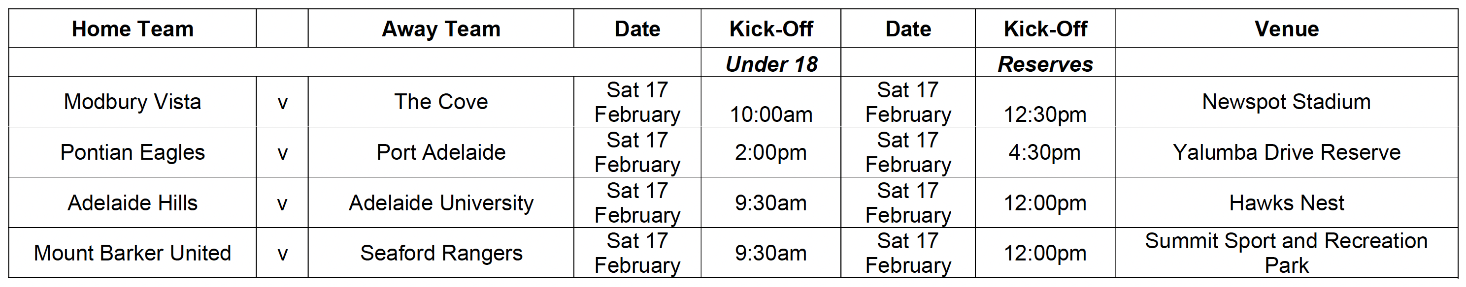 Bye: RAA NPLSA, State League 1, Eastern United, Gawler Eagles, Noarlunga United and Northern Demons.