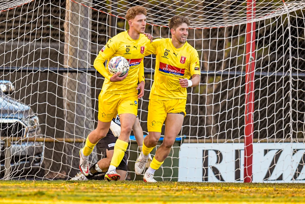 Santana Bartkowski (left) celebrates scoring a goal against his former club. (Image: Ken Carter)