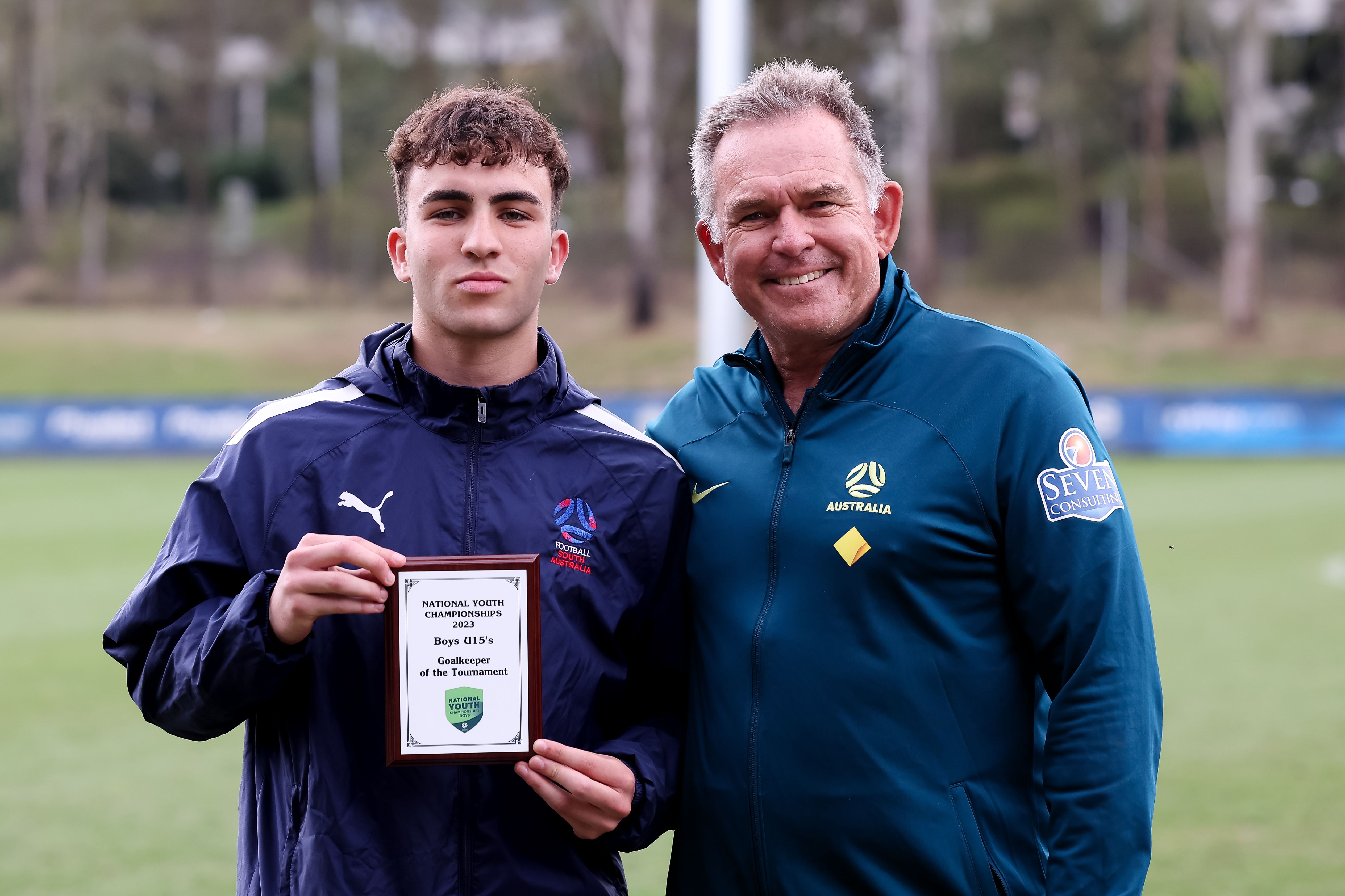 Our goalkeeper Noah Ellul was presented with the Under 15 Goalkeeper of the Tournament award by Football Australia Head of Goalkeeping and CommBank Matildas’ Goalkeeper Coach, Tony Franken.