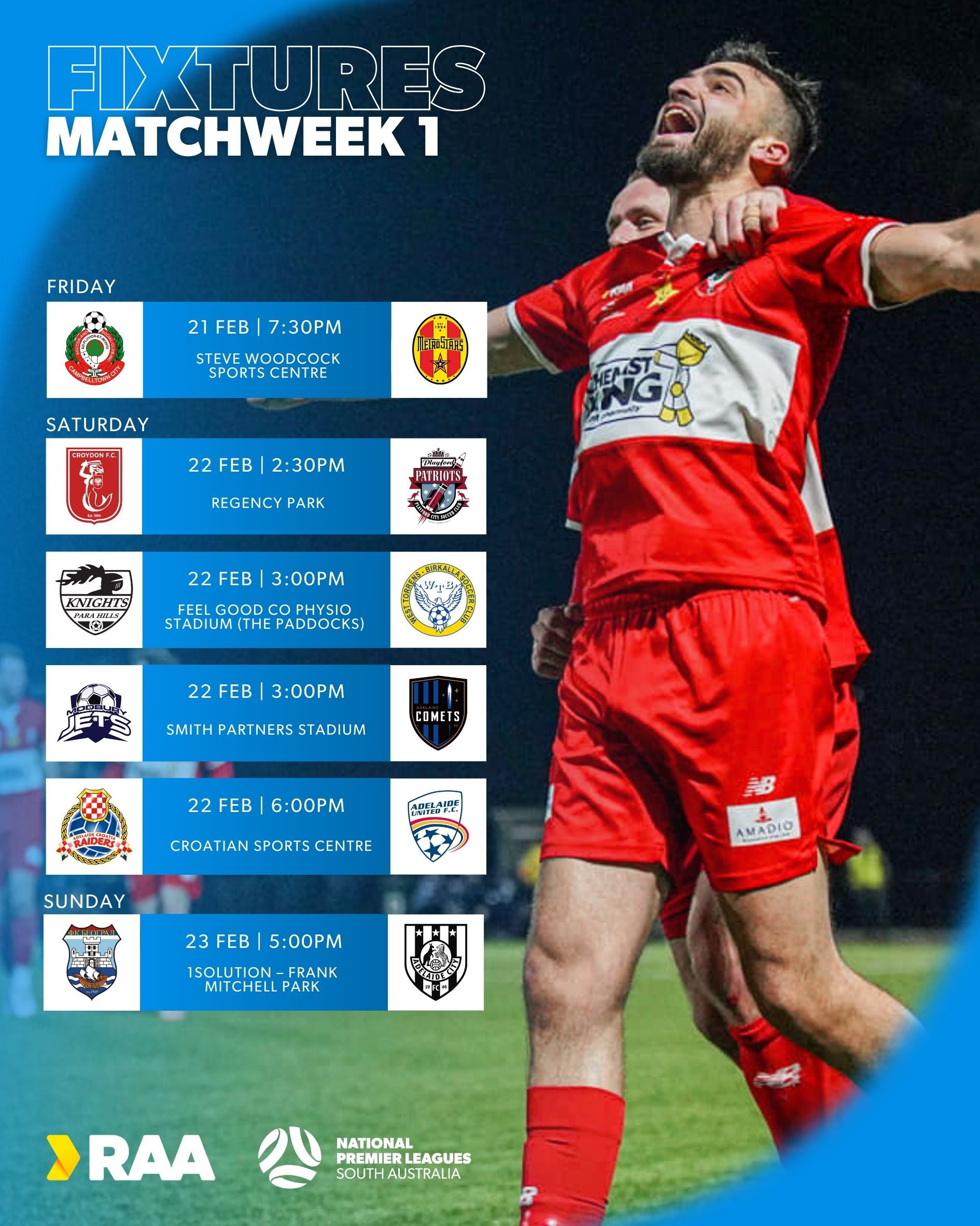 The action heats up on Saturday afternoon, starting at Regency Park from 2:30 PM, where newly promoted Playford meets Croydon FC. At 3:00 PM, Para Hills Knights will battle returning RAANPL side WT Birkalla, while Modbury Jets host Adelaide Comets at Smith Partners Stadium.