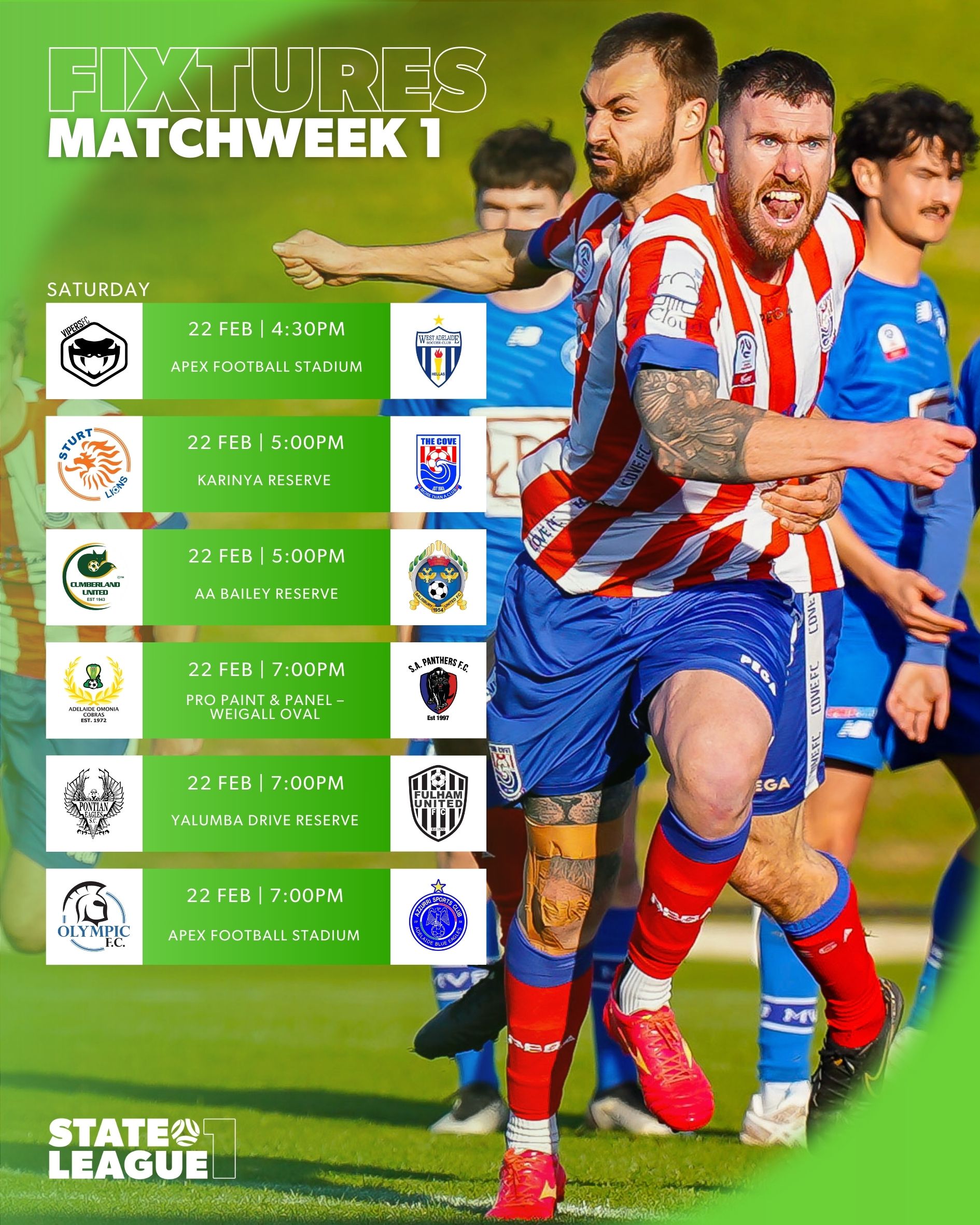 Adelaide Olympic faces an immediate challenge against Adelaide Blue Eagles. Promoted side Cove FC meets Sturt Lions in a highly anticipated clash. Pontian Eagles host Fulham United in an electrifying showdown. Elsewhere, Adelaide Cobras welcomes South Adelaide for a competitive Round 1 fixture.