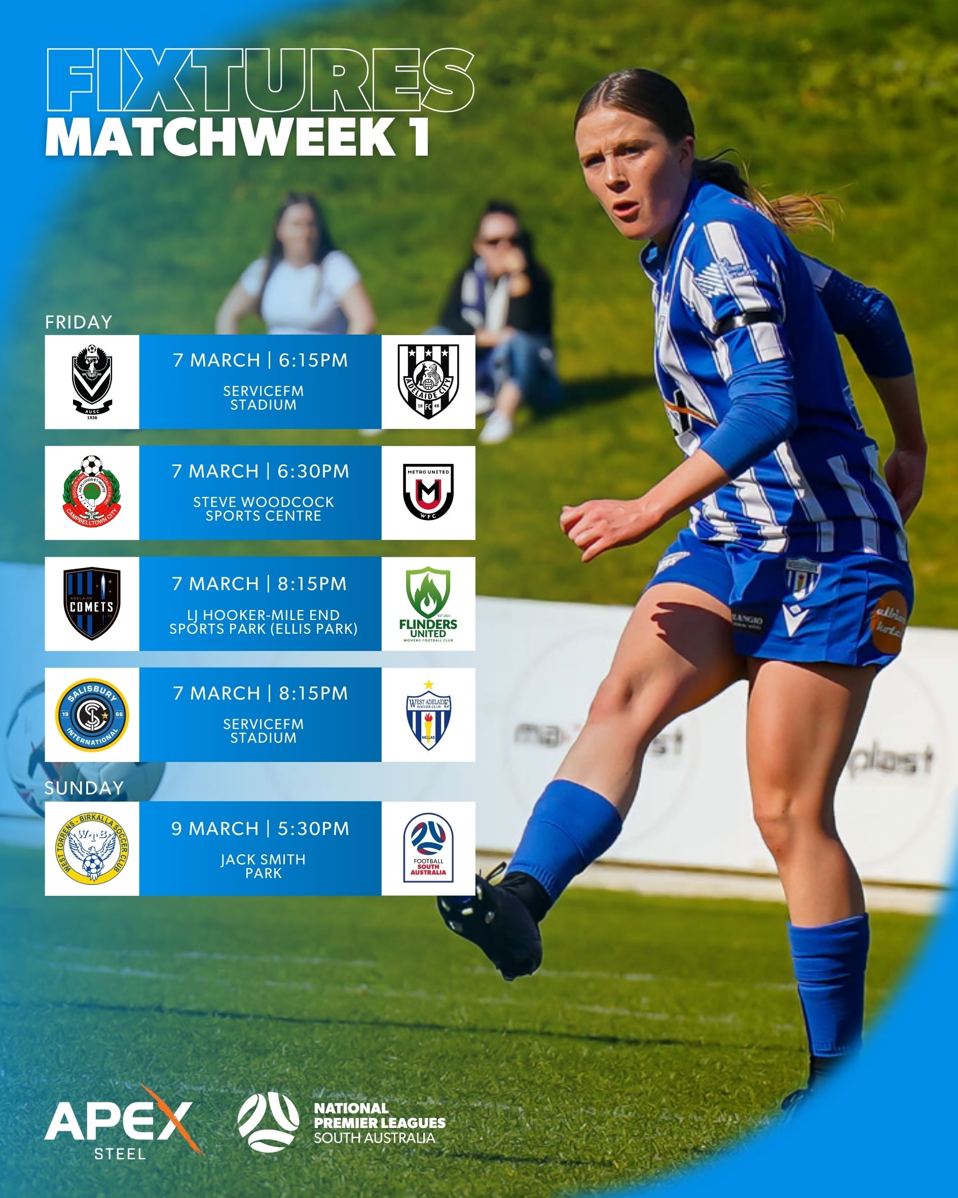 Campbelltown City, newly promoted to the Apex Steel WNPL, start their journey at home against Metro United at 6:30 PM, while Adelaide Comets face Flinders United at the newly named LJ Hooker-Mile End Sports Park (Ellis Park), completing Friday's fixtures.