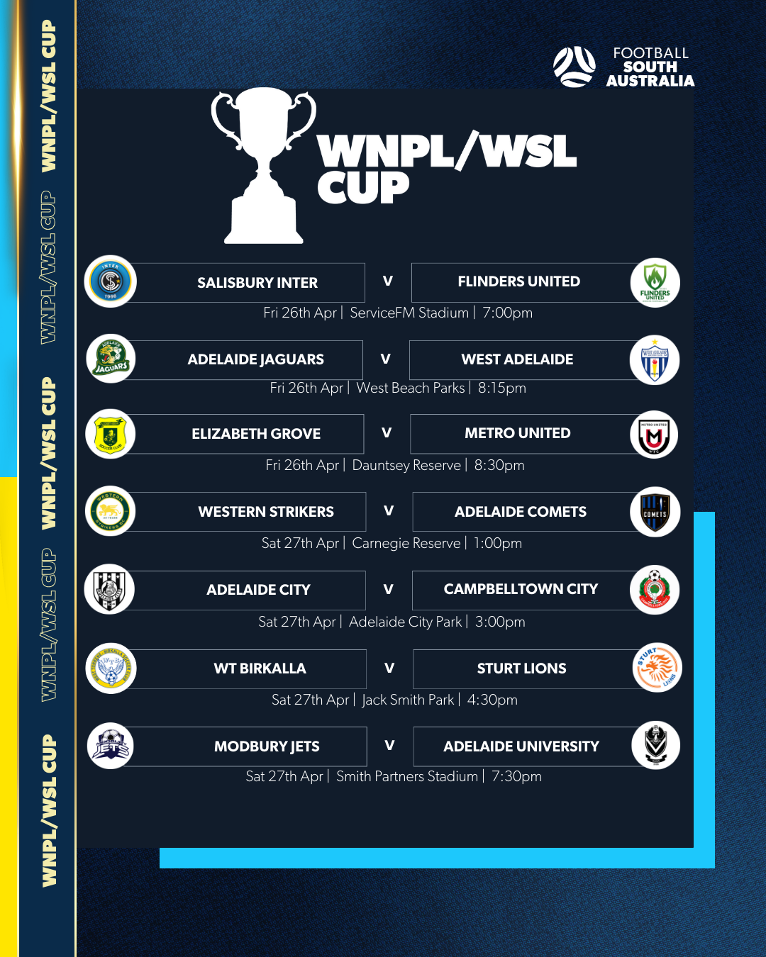 Football South Australia can announce the fixture information for the WNPL/WSL Cup Round 2.
